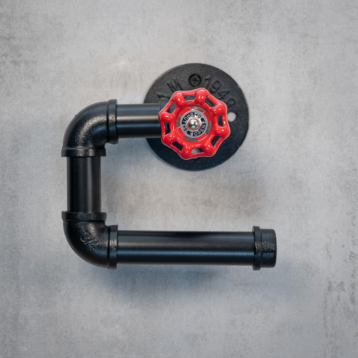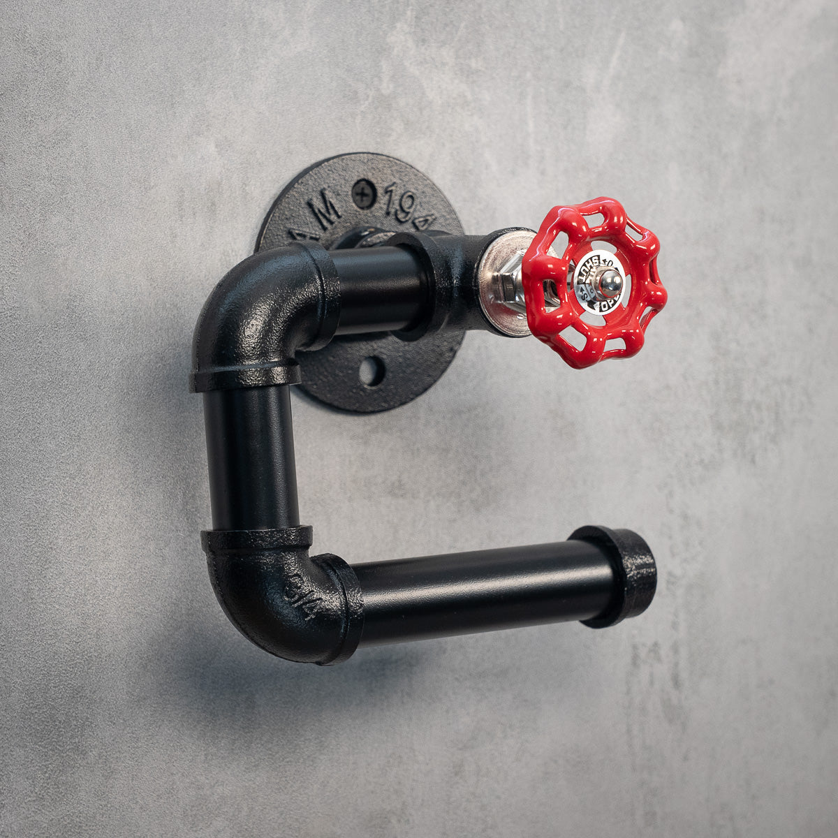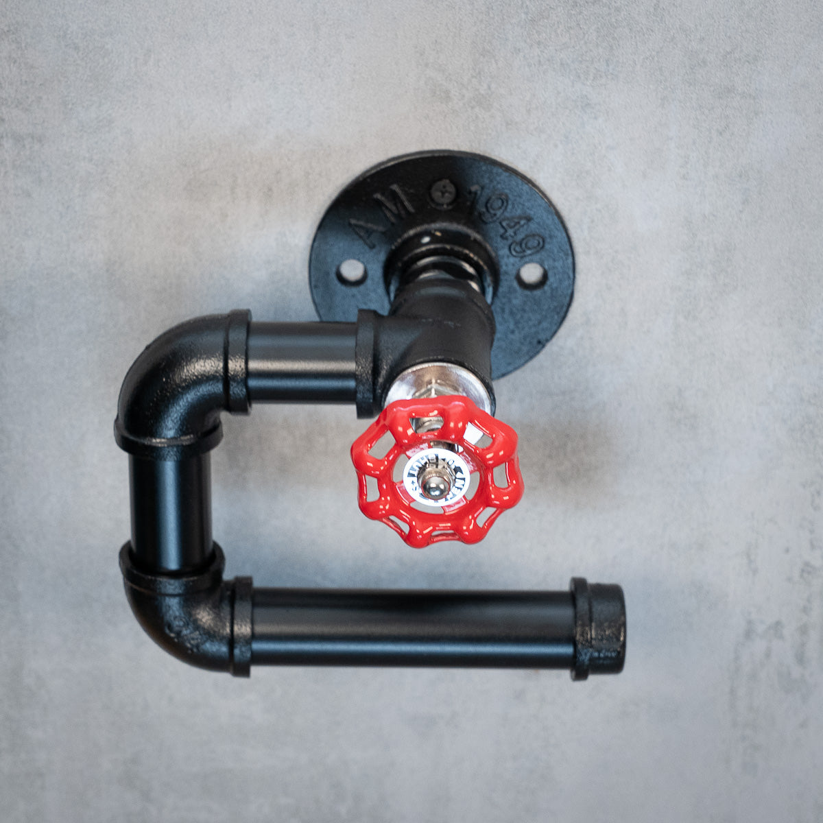 Denne toiletpapirholder kombinerer funktion og industrifølelse på en unik måde. Rullen hænger direkte under et rødt håndtag, som bliver en stærk visuel detalje og giver holderen en tydelig maskinel karakter. Kombinationen af sortlakeret stål og den røde farveaccent skaber en spændende kontrast, der gør modellen til mere end bare en praktisk løsning.