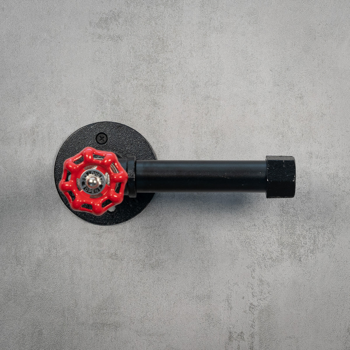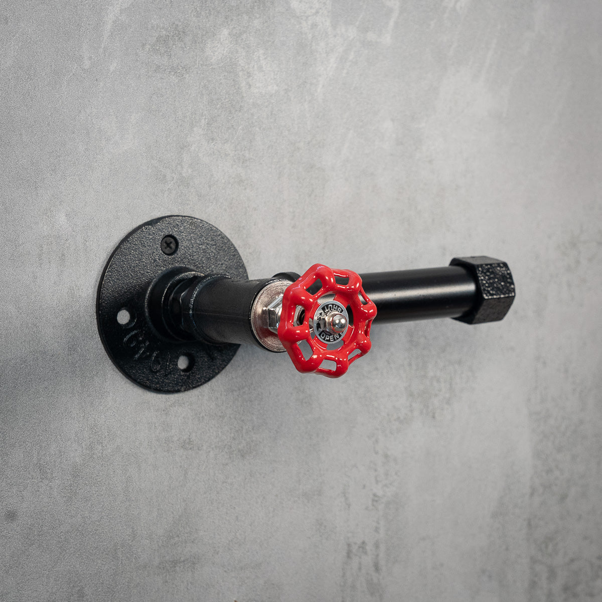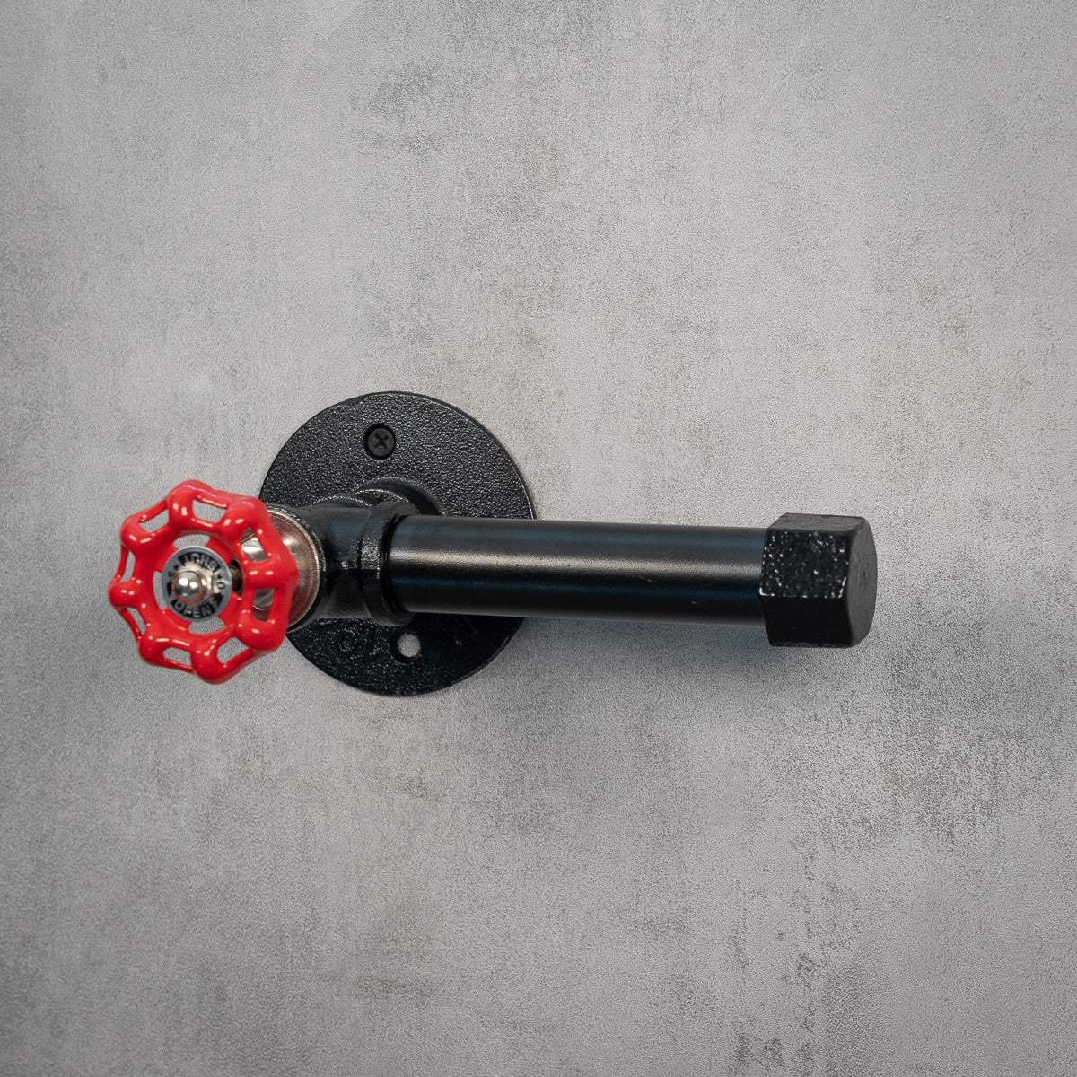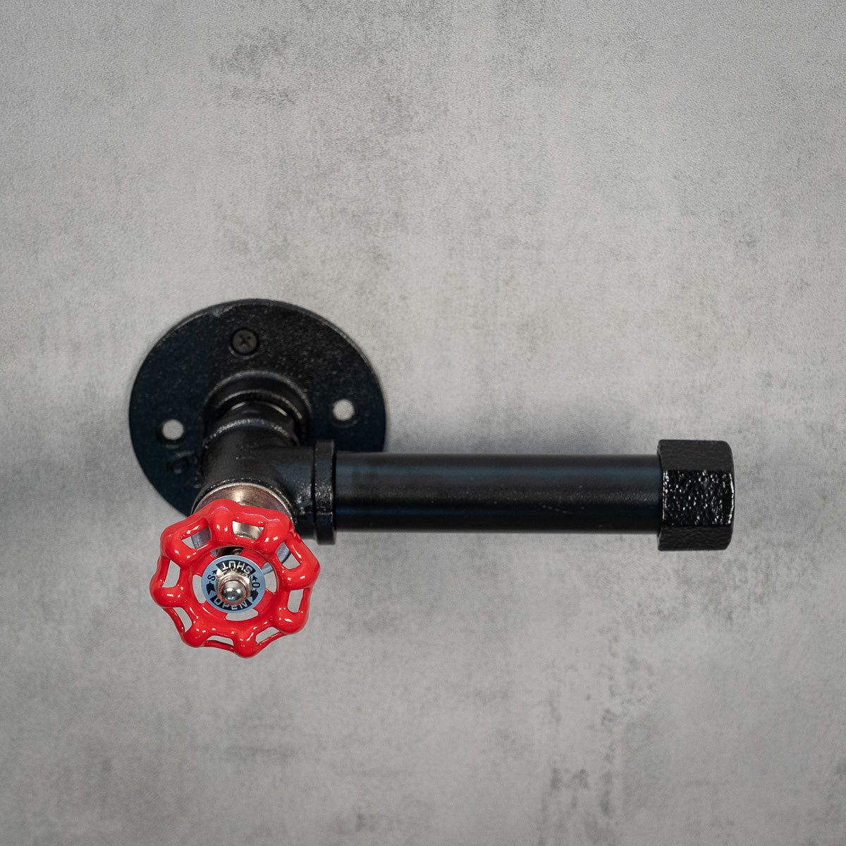 En unik toiletpapirholder, der kombinerer enkel funktion med stærk industrikarakter. Den robuste konstruktion i sortlakeret stål suppleres med et rødt håndtag, der giver en tydelig følelse af gammel maskinindustri. Yderst sidder en sekskantmøtrik, som forstærker det rå, mekaniske udtryk og gør modellen til et oplagt blikfang på badeværelset.