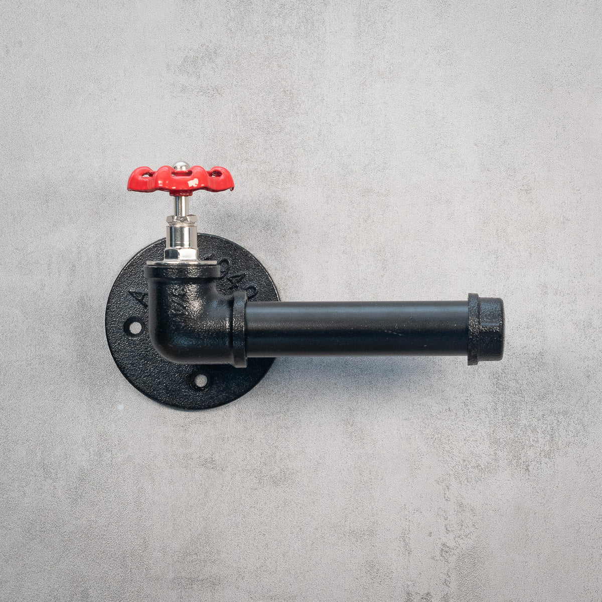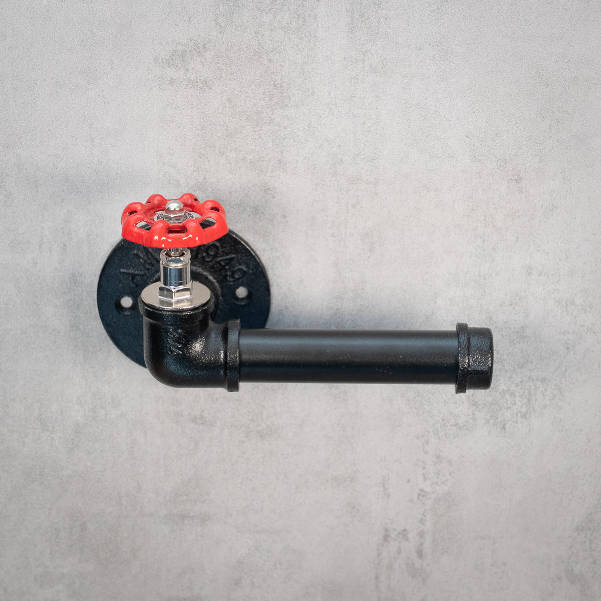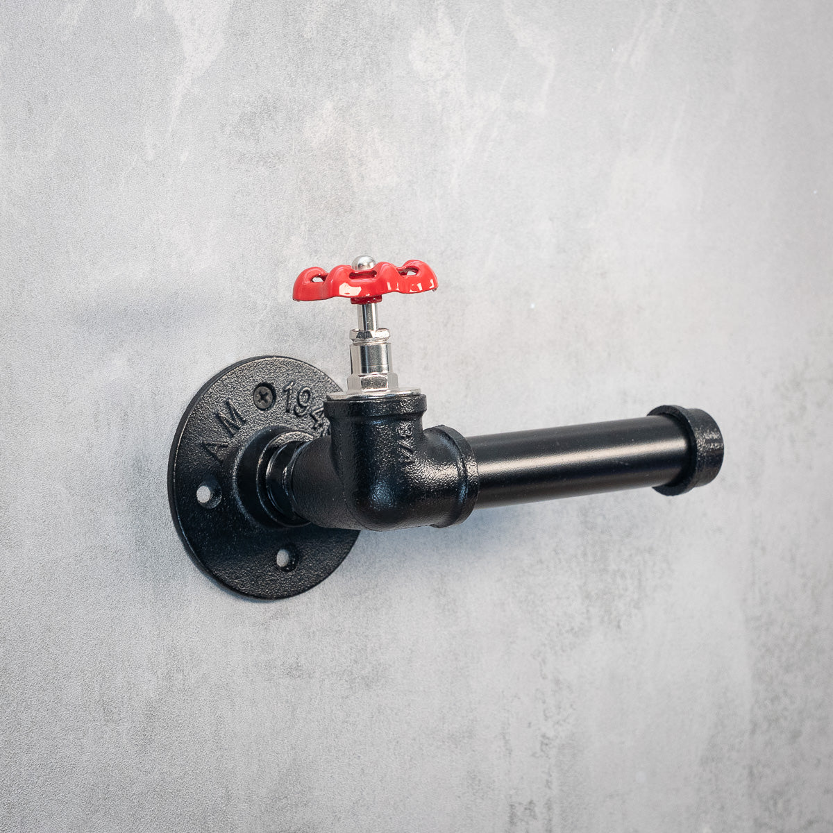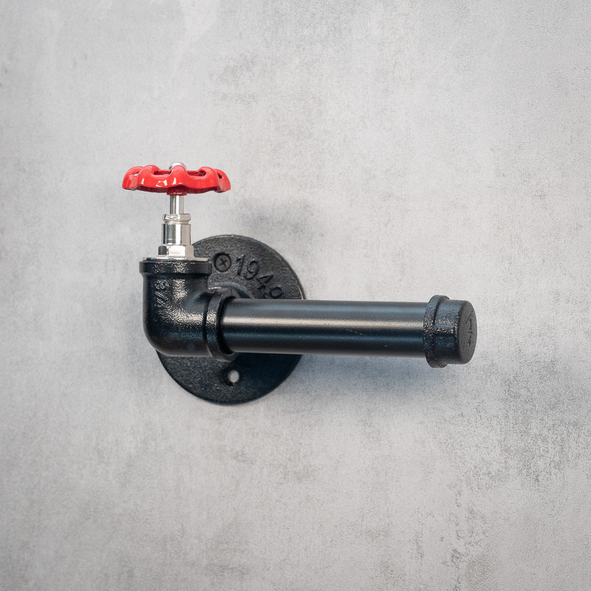 Toiletpapirholder med rødt håndhjul i industriel stil