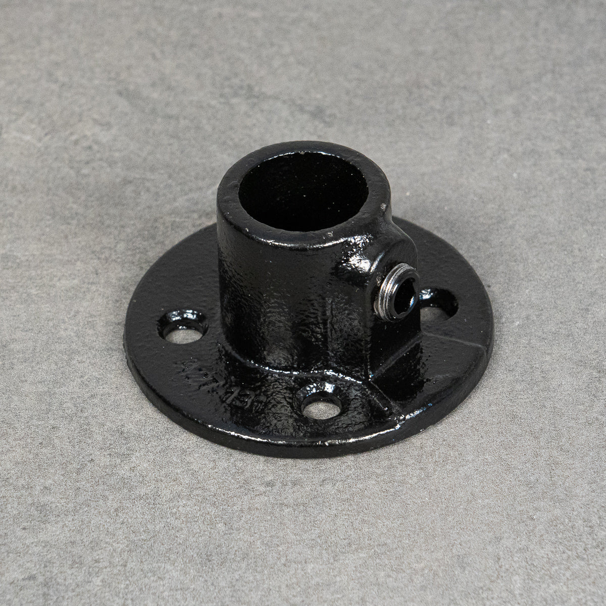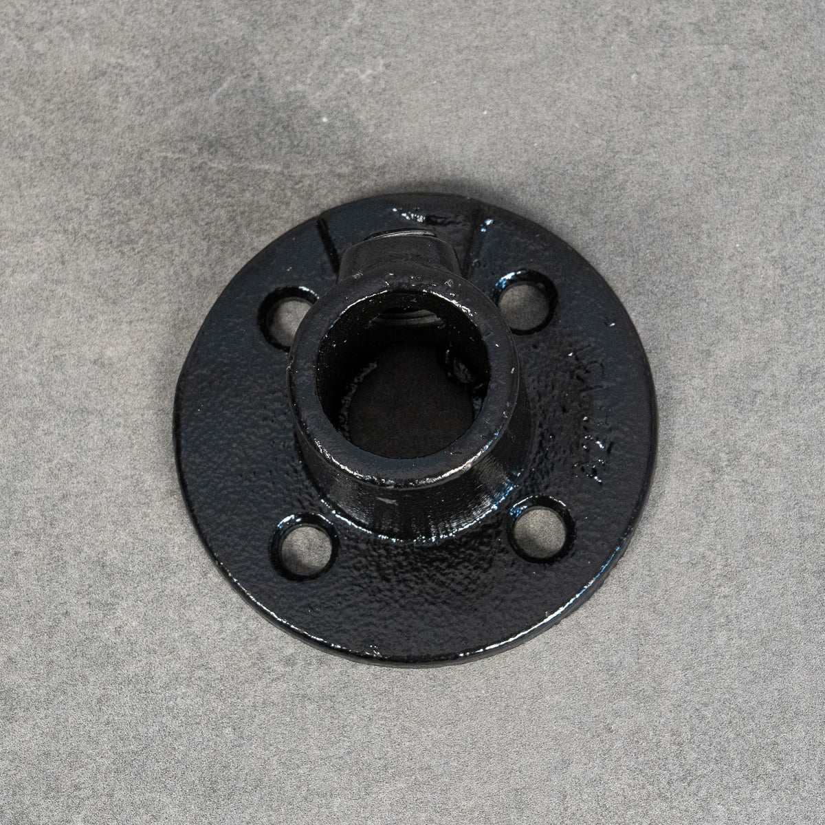 Fästet har fyra skruvhål för stabil och säker infästning, och den svartlackerade finishen ger ett stilrent uttryck som passar perfekt i både industriella och moderna miljöer.